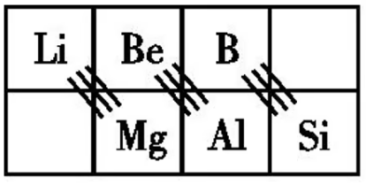 「对角线」规则又称斜线关系,指元素周期表中某一元素及其化合物的性质与它左上方或右下方的另一元素及其化合物的性质相类似。在第 23 周期中,具有典型「对角线」规则的元素有三对:锂与镁,铍与铝,硼与硅。有人从元素的电负性值相近解释「对角线」规则:锂 1.0、镁 1.2;铍 1.5、铝 1.5;硼 2.0、硅 1.8
