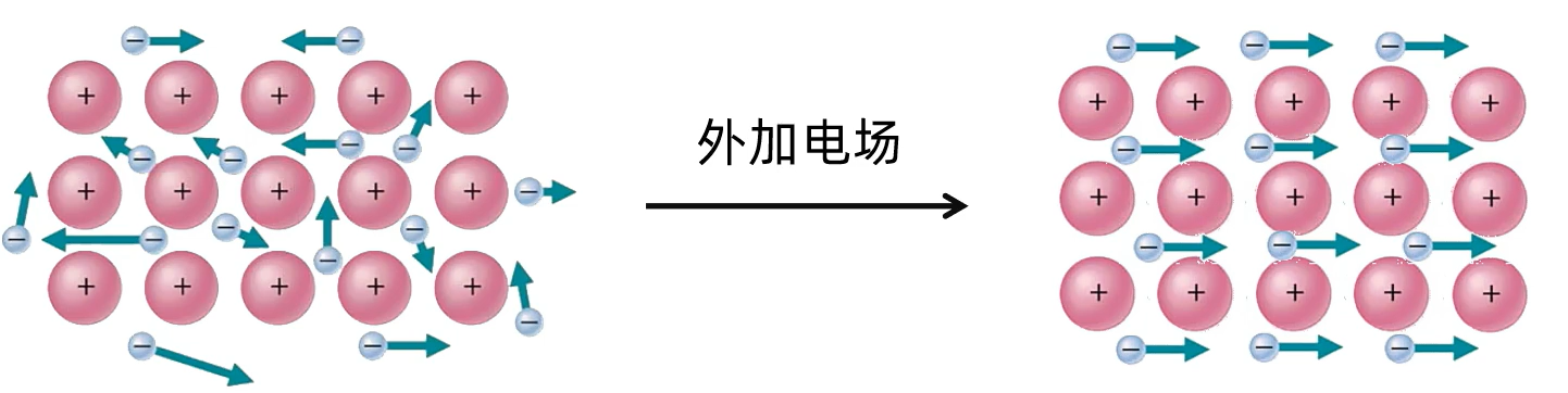 2. 金属的导电性 在金属晶体中,存在许多自由电子,这些电子移动是没有方向的,但是 在外加电场的作用下,自由电子就会发生定向移动,形成电流,使金属表现出导电性 当温度升高时,阳离子的振动加剧,对自由电子的定向移动产生了阻碍作用,故导电能力下降。金属导电的粒子是自由电子,而电解质溶液导电的粒子是自由移动的阴阳离子