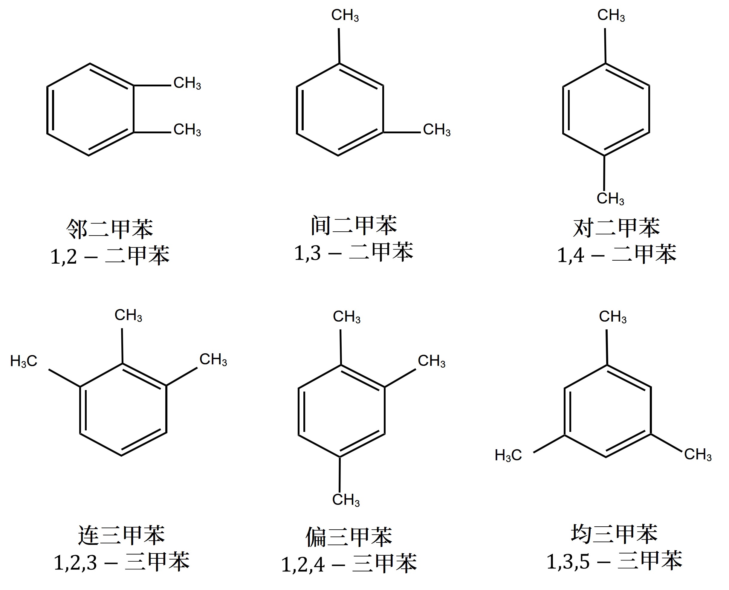 当苯环上有两个取代基时,根据取代基在苯环上的相对位置,可分别用「邻」「间」「对」来表示,如「对二甲苯」 「邻甲基苯酚」 等;当苯环上有三个 相同 取代基时,根据取代基在苯环上的相对位置,可分别用「连」「偏」「均」来表示。